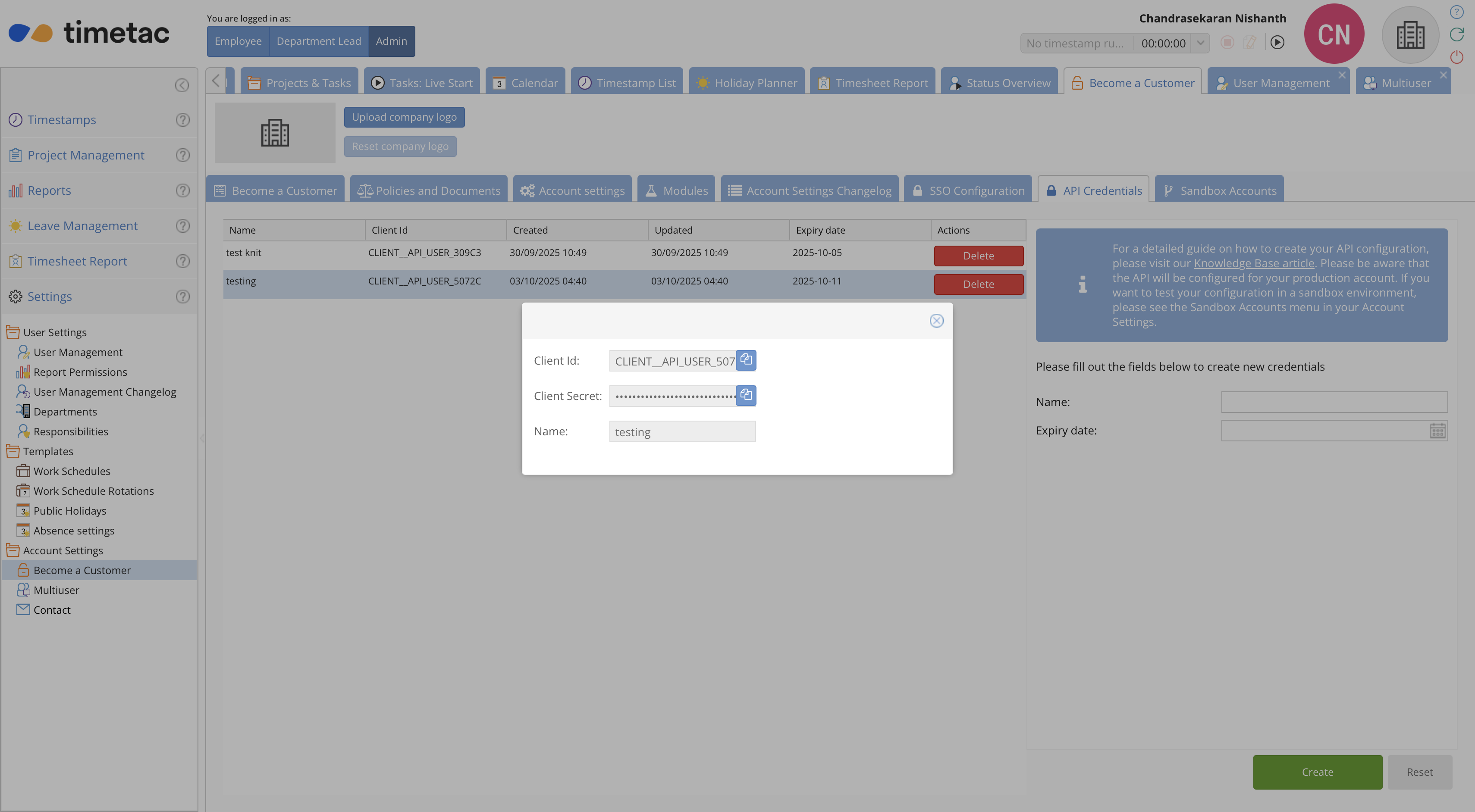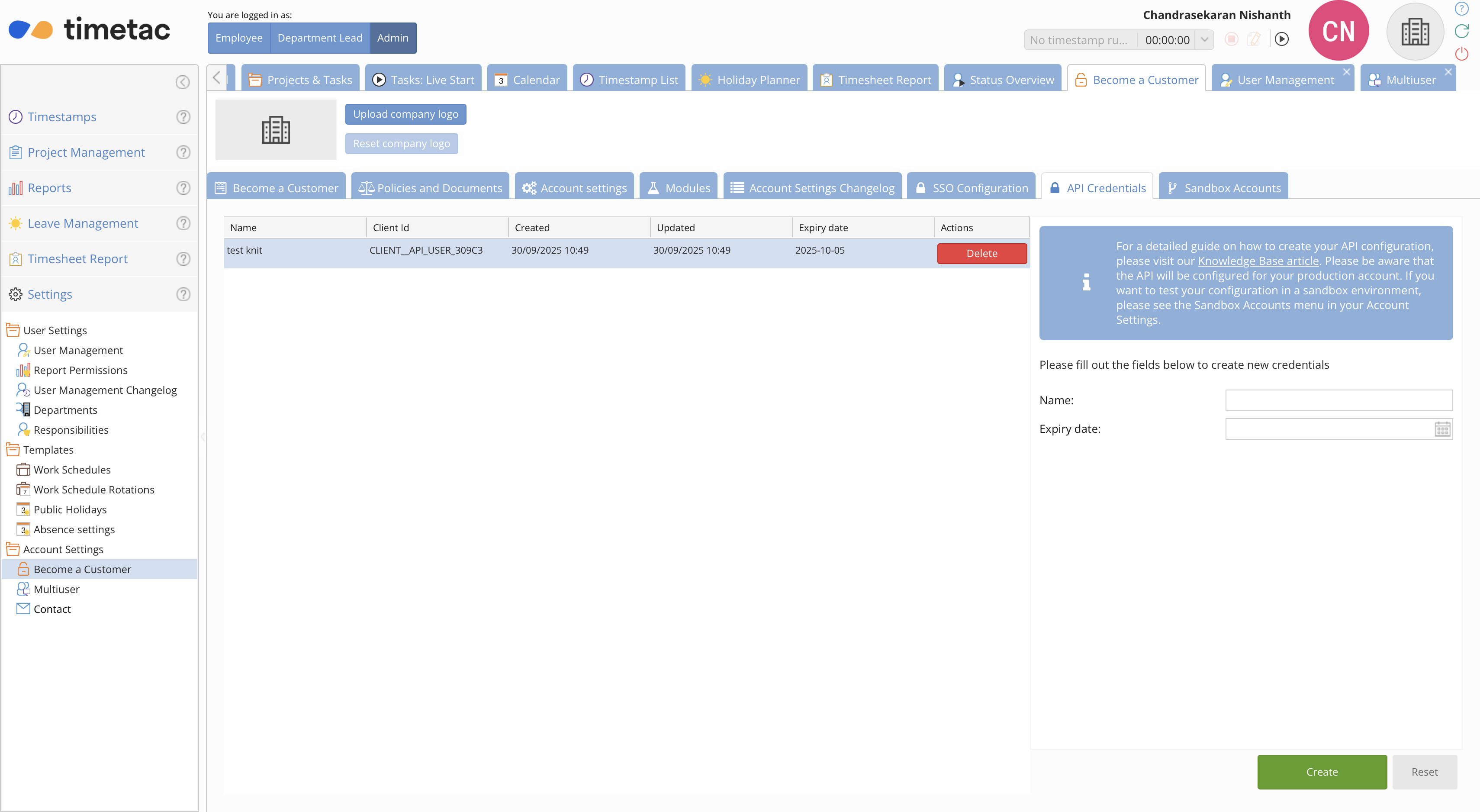 Select the API Credentials tab, enter your credentials name and expiry date, then click create.